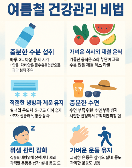 우리나라 여름철은 건강을 위협하는 다양한 요소들로 가득하지만, 올바른 정보와 실천 가능한 습관만 있다면 충분히 건강하게 보낼 수 있습니다. 여름 날씨에 맞춘 생활습관, 제철 보양식 섭취, 체온과 수분 조절을 통한 자기 관리가 핵심입니다. 지금부터라도 여름철 건강관리를 위한 작은 실천을 시작해보세요. 당신의 건강한 여름을 응원합니다!